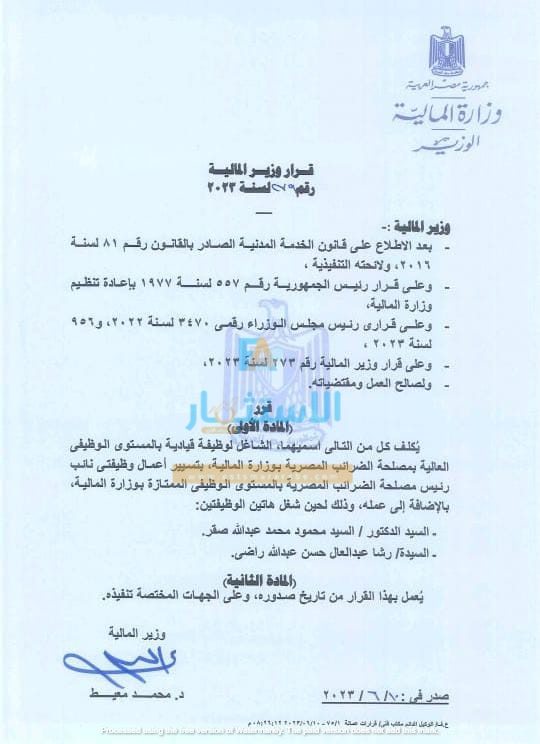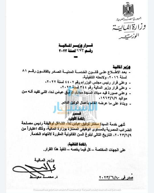 وكذلك على قرار وزير المالية رقم 273 لسنة 2023، ولصالح العمل بمقتضياته.