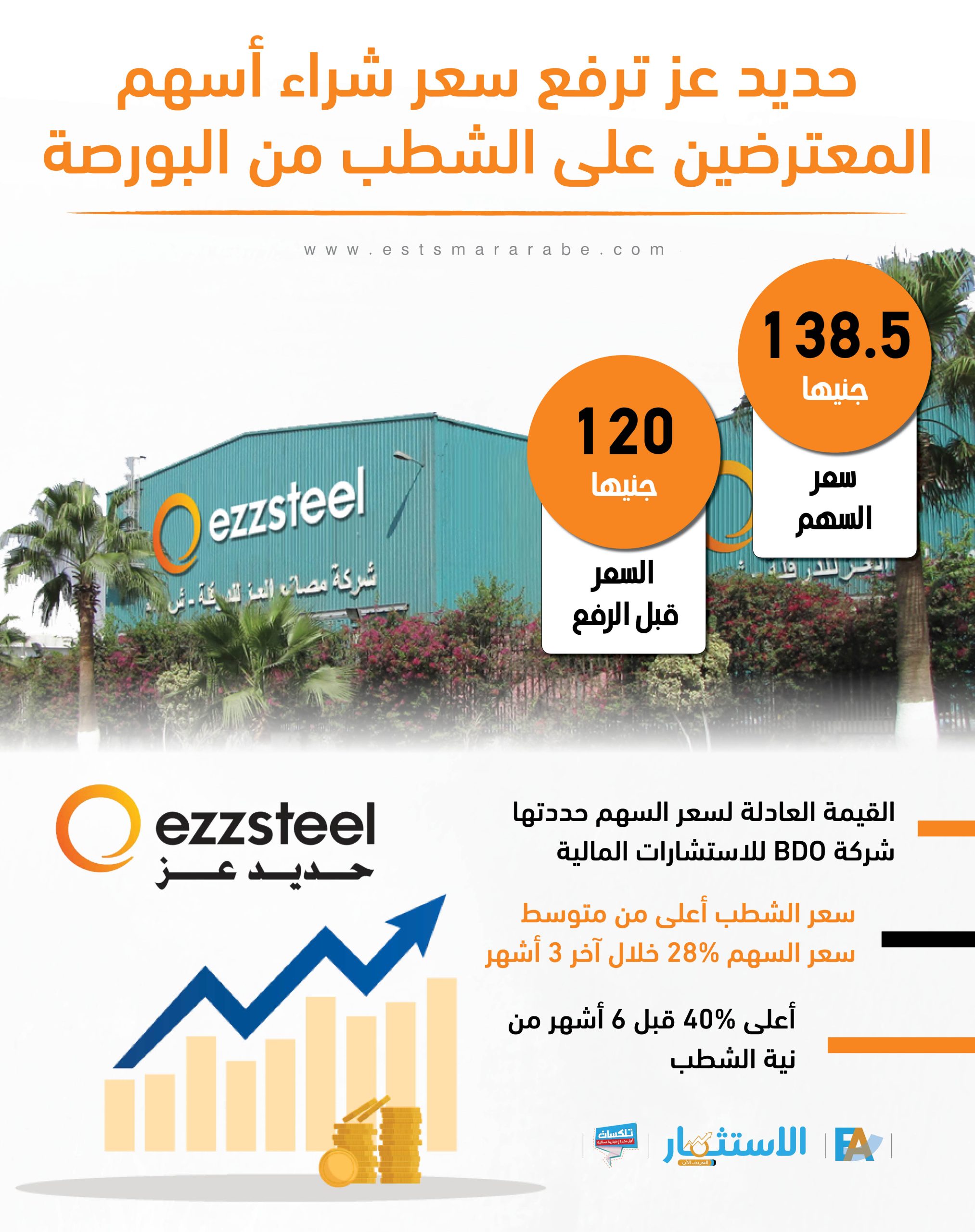 قررت شركة حديد عز، تحديد سعر شراء أسهم الشطب، للمعترضين والمساهمين الذين يبدون رغبتهم في عدم الاستمرار في الشركة بعد الشطب وفقًا للقيمة العادلة الواردة في تقرير المستشار المالي المستقل شركة BDO، والمحددة بسعر 138.15 جنيه للسهم.