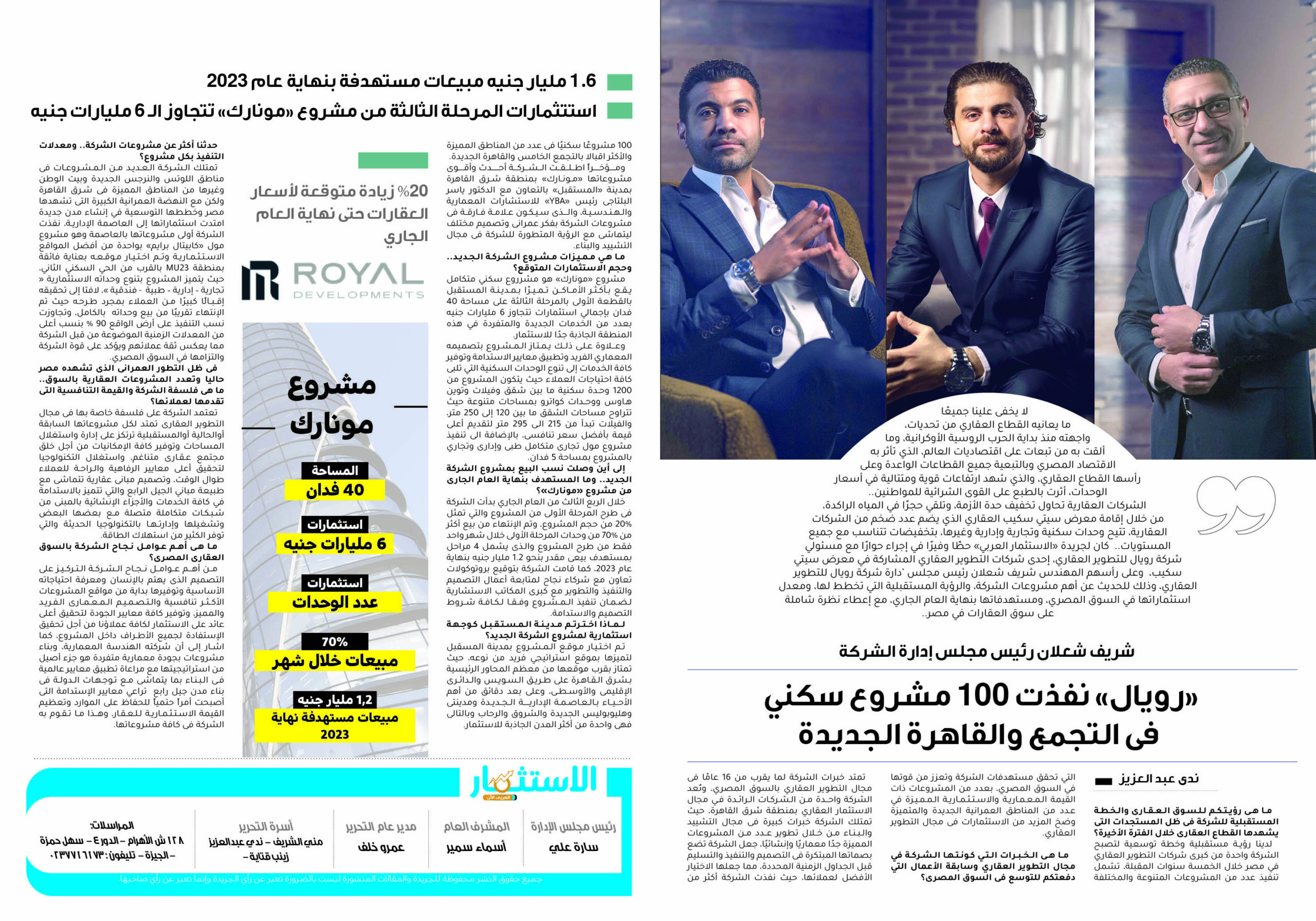 كان لجريدة “الاستثمار العربي” حظًا وفيرًا في إجراء حوارًا مع مسئولي شركة رويال للتطوير العقاري، إحدى شركات التطوير العقاري المشاركة في معرض سيتي سكيب، وعلى رأسهم المهندس شريف شعلان رئيس مجلس ‘دارة شركة رويال للتطوير العقاري، وذلك للحديث عن أهم مشروعات الشركة، والرؤية المستقبلية التي تخطط لها، ومعدل استثماراتها في السوق المصري، ومستهدفاتها بنهاية العام الجاري، مع إعطاء نظرة شاملة على سوق العقارات في مصر..