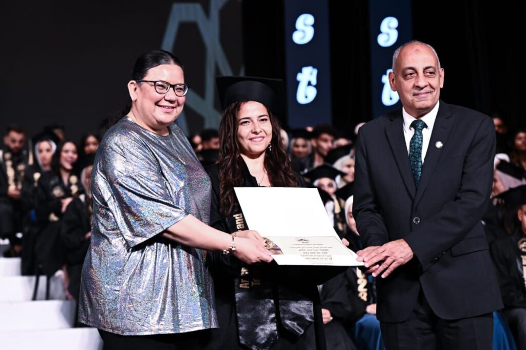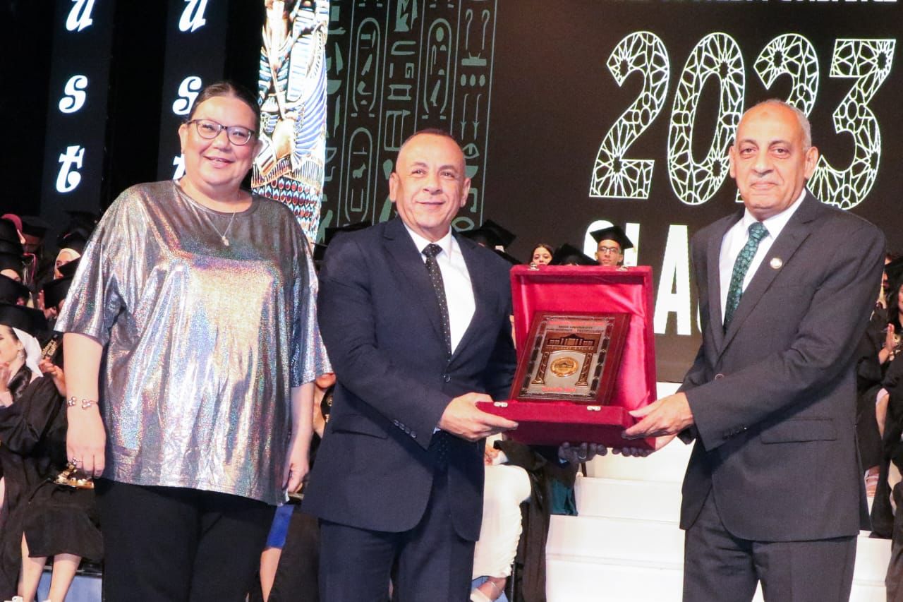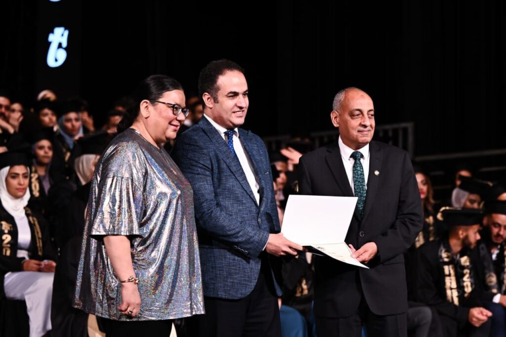 وأضاف د. شريف رفعت أن أهم ما تحرص عليه جامعة مصر للعلوم والتكنولوجيا مع الطلبة هو تنمية وتطوير المهارات التى تؤهلهم للمنافسة بقوة في سوق العمل ومواجهة التحديات المختلفة، ووجه رسالته للخريجين قائلا “أوجه رسالتي لأبنائي الطلبة وأتمني لهم التوفيق في المرحلة المقبلة من حياتهم والتي ستكون من أحسن لأحسن، مؤكدا على أن علاقة الجامعة بأبنائها الخريجين لا تتوقف عند مرحلة التخرج ولكن تمتد لأبعد من ذلك، مؤكدا علي ضرورة متابعة الخريجين للبريد الالكتروني الشخصي الخاص بهم والمسجل لدى الجامعة لأن الجامعة ستتواصل مع الخريجين من خلال هذه الوسيلة لتطلعهم علي أخر المستجدات في حالة وجود دورات تدريبية لهم أو تنمية مهارات أو فرصة عمل مناسبة لمجال تخصصهم .