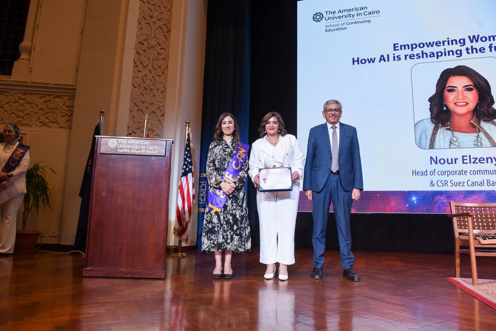 وقام الدكتور محمود علام – عميد كليه التعليم المستمر بالجامعة الأمريكية بالقاهرة، الدكتورة دعاء سالم – رئيس اول وحده الاتصال و الشراكات لكليه التعليم المستمر بالجامعة الأمريكية بالقاهرة و مؤسس مبادرة “هي قادره” التي تدعم المراءة و مساهمتها في تنميه الاقتصاد المصري بتكريم بنك قناة السويس لدورة اثناء الفعاليات.