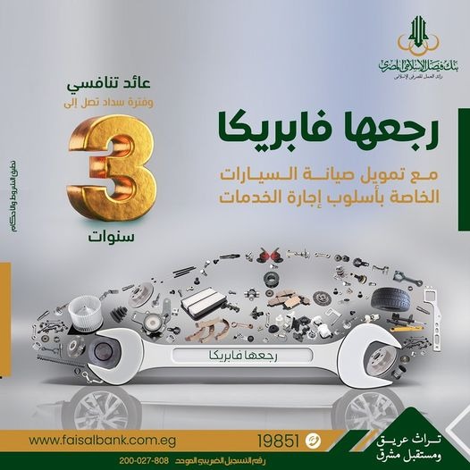 يتيح بنك فيصل الإسلامي المصري، لعملائه قرض تمويل صيانة السيارات، بمدة سداد تصل إلى 3 سنوات، بأسلوب إجارة الخدمات.