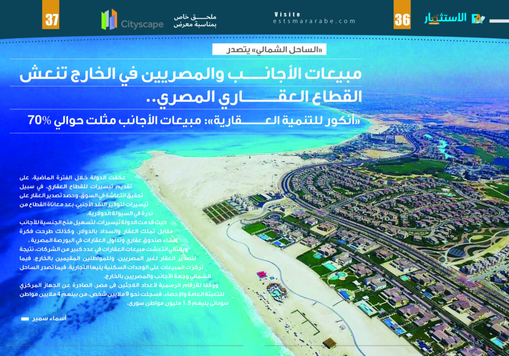 وبالتالي انتعشت مبيعات العقارات في عدد كبير من الشركات، نتيجة لتصدير العقار لغير المصريين، وللمواطنين المقيمين بالخارج، فيما تركزت المبيعات على الوحدات السكنية يليها التجارية، فيما تصدر الساحل الشمالي وجهة الأجانب والمصريين بالخارج.