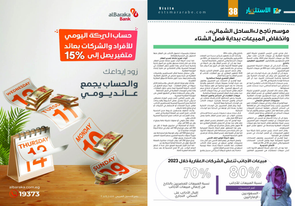 وكذلك أشار إلى أن مبيعات الشركة للمصريين المقيمين بالخارج مثلت نحو 80% من مبيعات الشركة لغير المصريين.