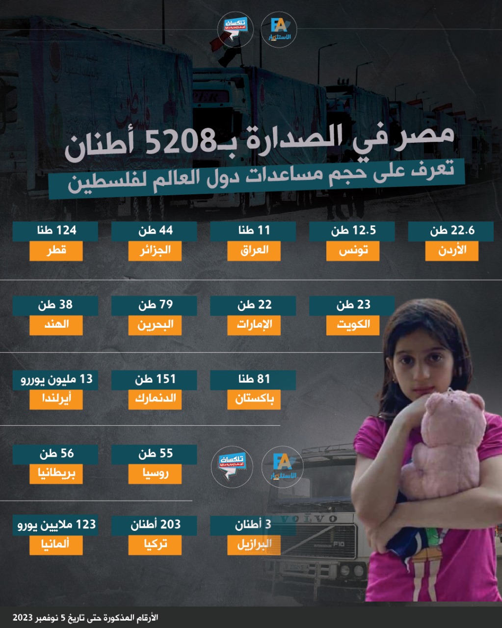حيث كشفت غرفة العمليات المركزية لإدارة الأزمات والكوارث بجمعية الهلال الأحمر، عن حجم المساعدات الدولية المقدمة للشعب الفلسطيني، والتى جاء وزنها بالطن كالآتي: