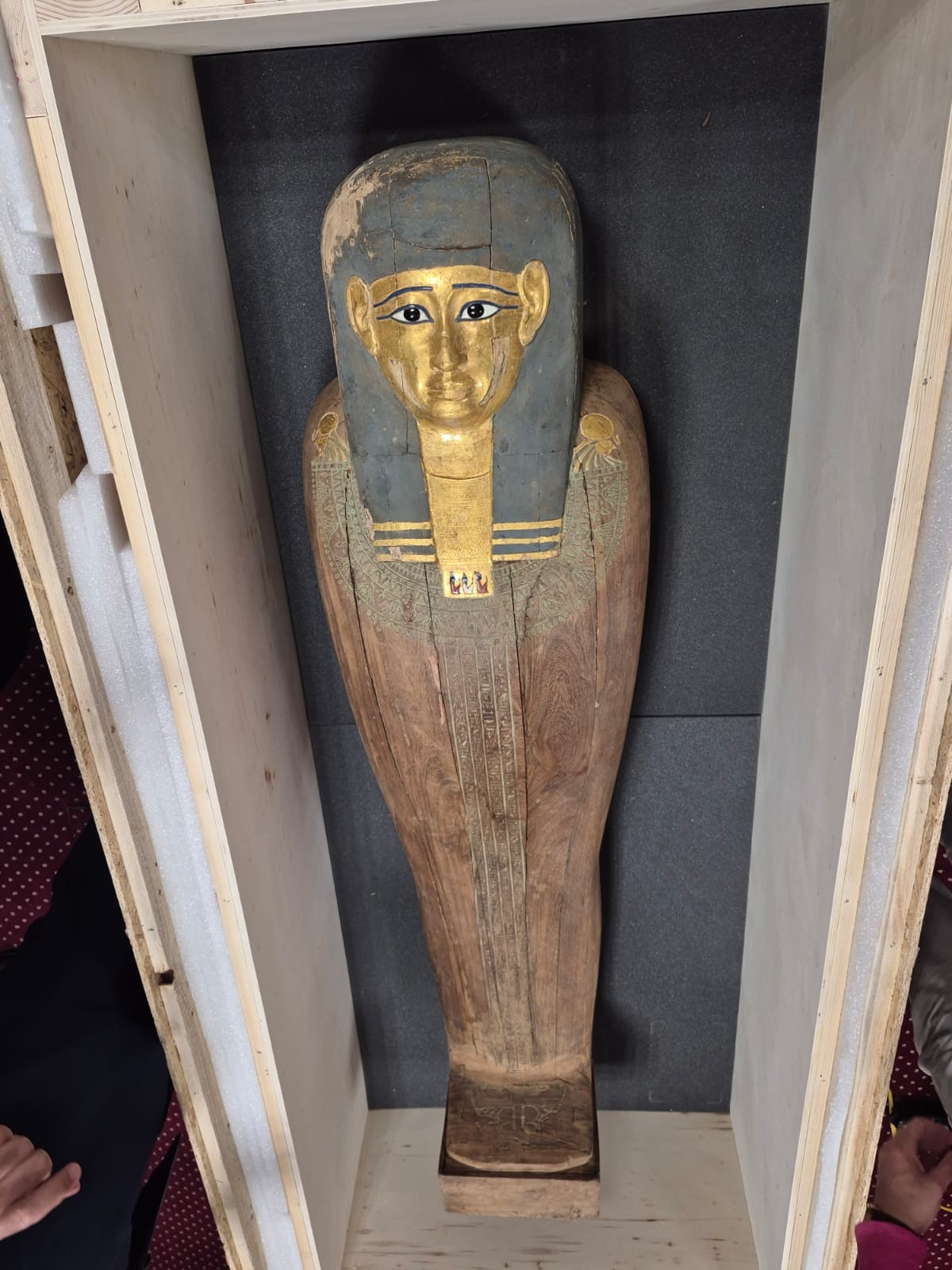 وأشار شعبان عبد الجواد مدير عام الادارة العامة للآثار المستردة والمشرف على الإدارة المركزية للمنافذ الأثرية بالمجلس الأعلى للآثار، الى ان القطع الأثرية المستردة عبارة عن تابوت خشبي مطلي ومذهب من العصر المتأخر، ويتميز بزخارفه الدقيقة التي تعكس الطقوس الجنائزية وتقنيات صناعة التوابيت في ذلك العصر، بالإضافة إلى لحية خشبية أثرية كانت جزءًا من تمثال مصري قديم، من عصر الدولة الوسطى، وتمثل نموذجًا لأحد العناصر الرمزية المهمة في فن النحت المصري القديم.