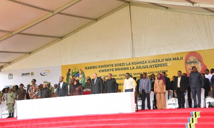 في إطار احتفالية بدء الملء الأول لخزان مياه مشروع سد ومحطة جوليوس نيريري الكهرومائية بتنزانيا.