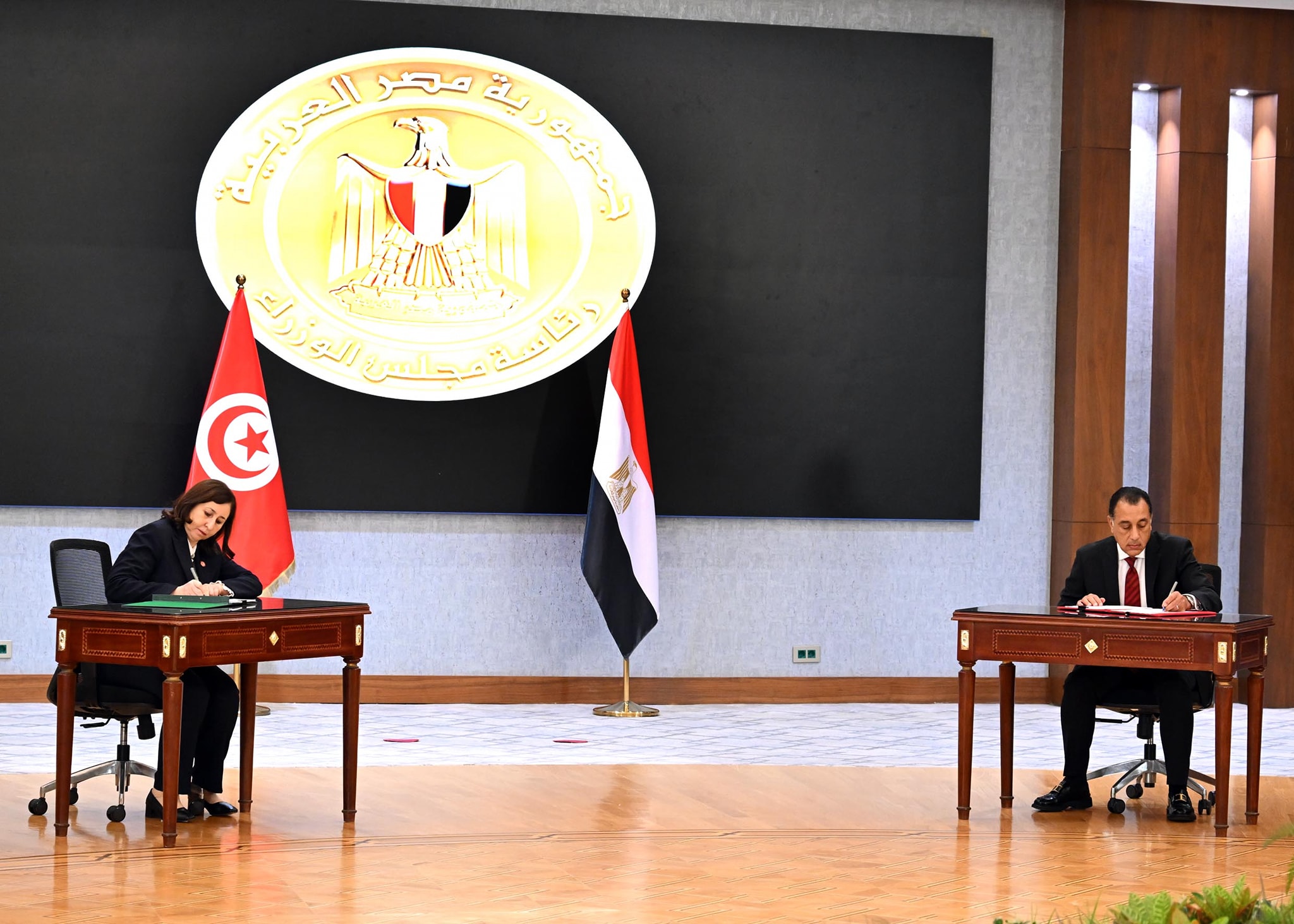 شهد مصطفى مدبولي رئيس مجلس الوزراء ونظيرته التونسية سارة الزعفراني، اليوم، مراسم توقيع 8 وثائق تعاون في ختام أعمال اللجنة العليا المصرية التونسية المشتركة التي عقدت بالعاصمة الإدارية الجديدة، وشملت مجالات الصحة والرياضة والتجارة والشئون الاجتماعية والدبلوماسية.