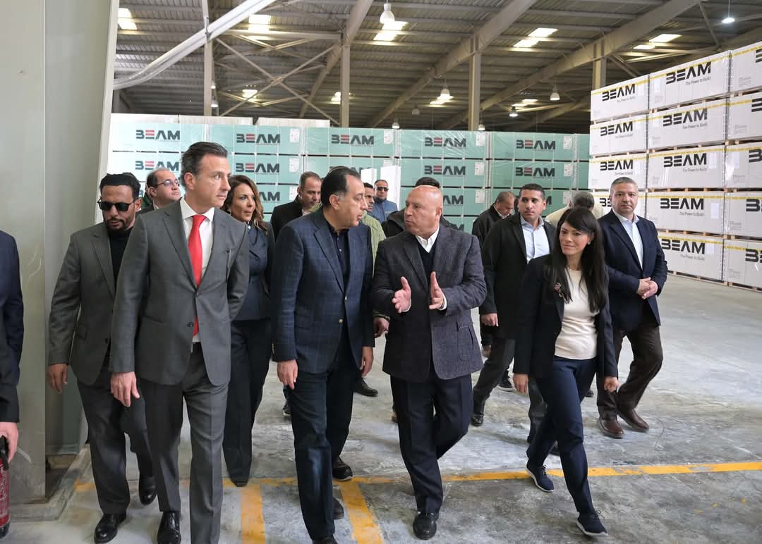 وخلال الجولة تفقد رئيس الوزراء مراحل خط انتاج الجبسون بورد، بداية من استقبال المواد الخام، ومروراً بمنطقة التصنيع، من مراحل الخلط ثم التجفيف ثم التقطيع، وصولاً إلى المنتج النهائي والتغليف والتجهيز للشحن.