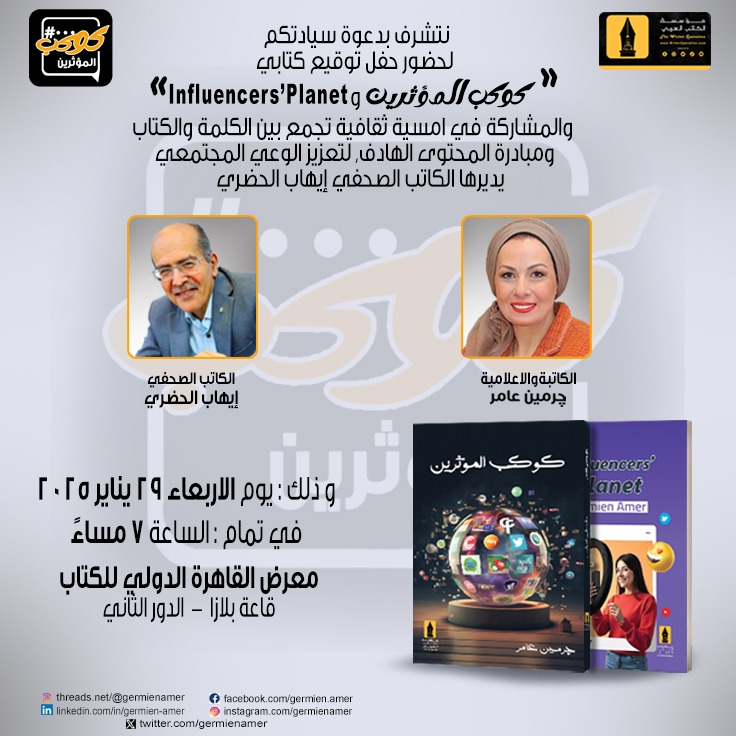 تنطلق ندوة لمناقشة كتاب “كوكب المؤثرين” بنسختيه العربية والإنجليزية للكاتبة چرمين عامر عضو اتحاد الاعلاميين العرب، بعد غد الأربعاء، على هامش فعاليات النسخة الـ56 من معرض القاهرة الدولي للكتاب.