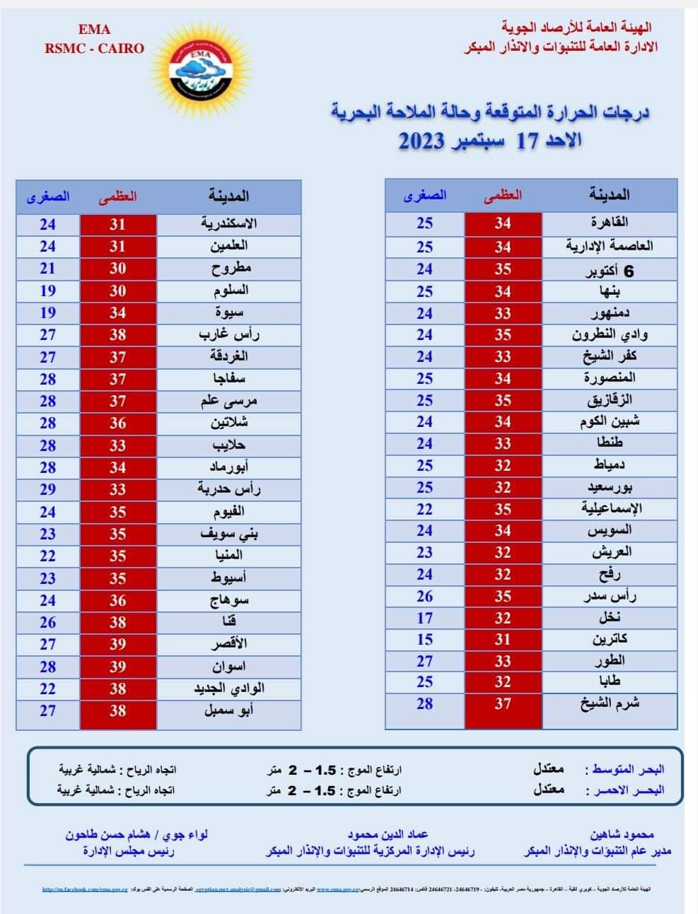 وطبقًا لمحطات الرصد التابعة للهيئة العامة للأرصاد الجوية يتوقع أن تسجل درجات الحرارة لبعض المناطق كما يلي :