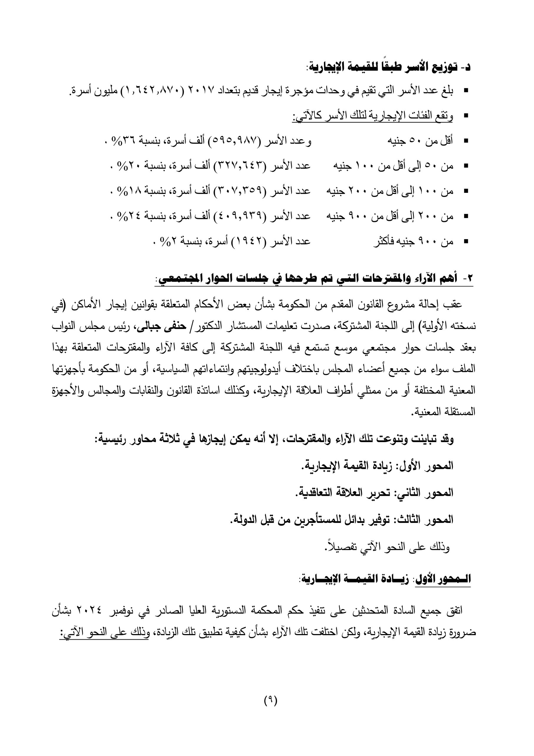تشكل لجان حصر على مستوى كل محافظة بقرار من المحافظ، لتقسيم المناطق التي بها أماكن مؤجرة لأغراض السكن إلى مناطق متميزة ومتوسطة واقتصادية، بناءً على معايير تشمل الموقع الجغرافي، مستوى البناء، المرافق المتوفرة، شبكة الطرق والخدمات، والقيمة الإيجارية السنوية للعقارات.