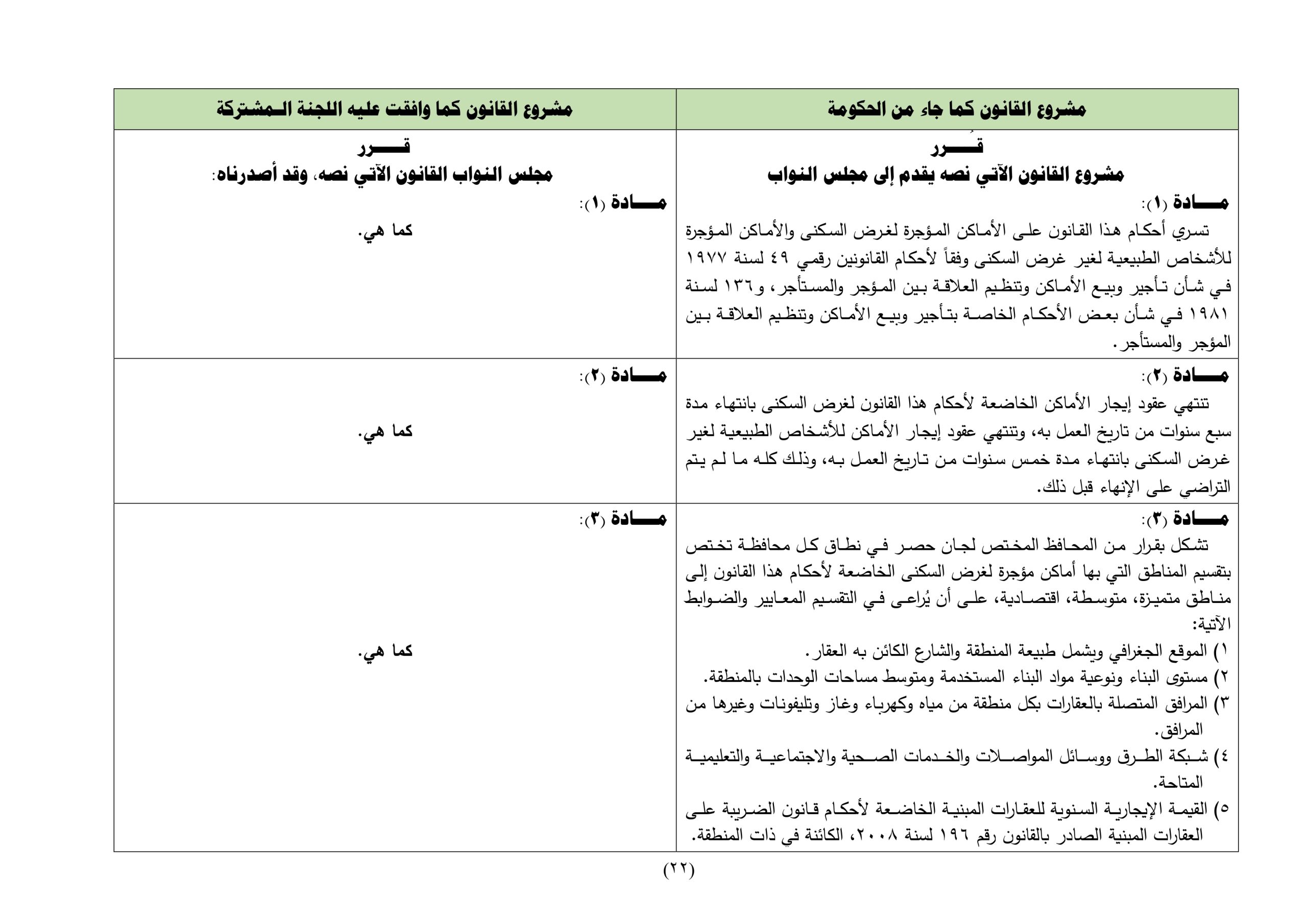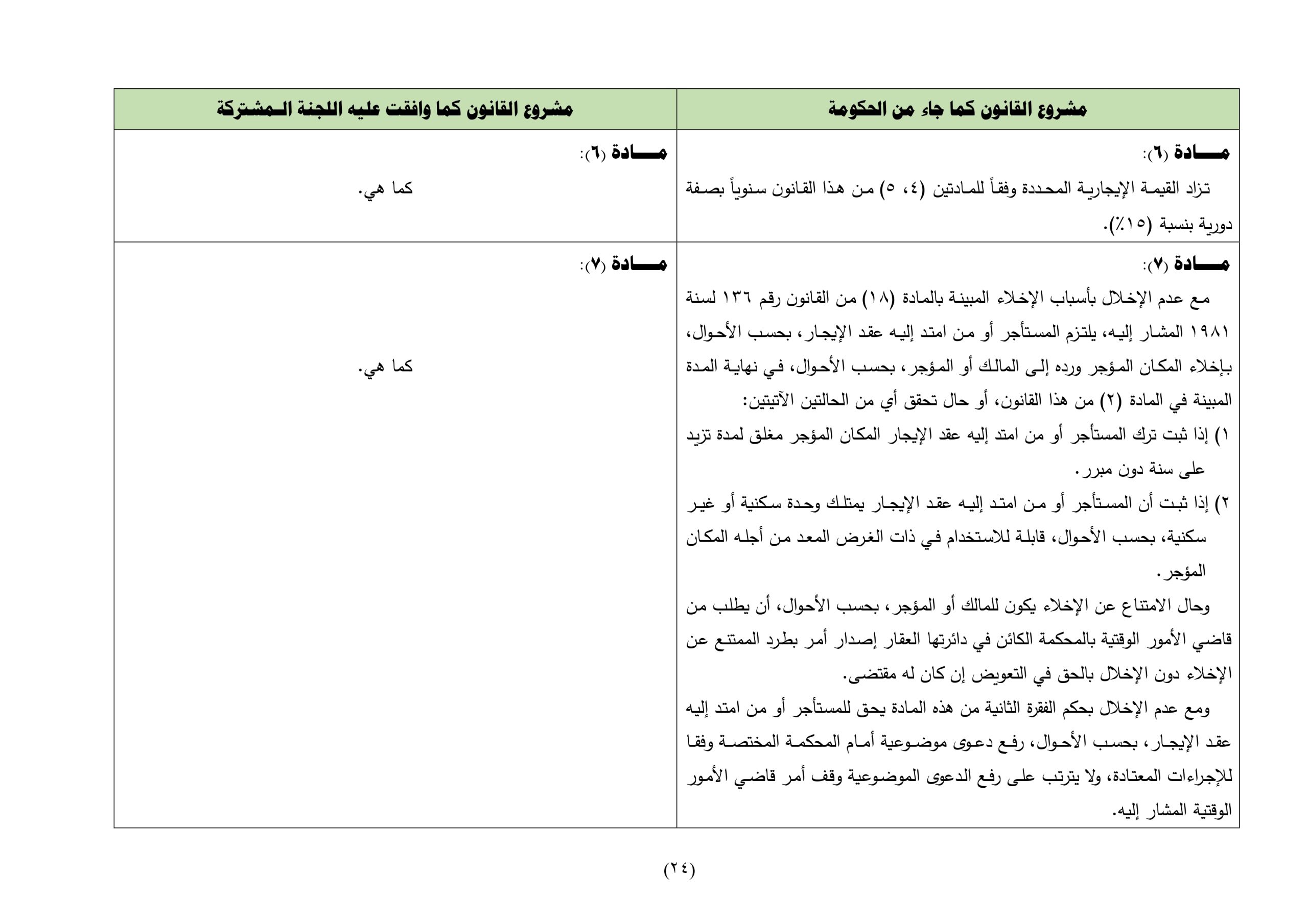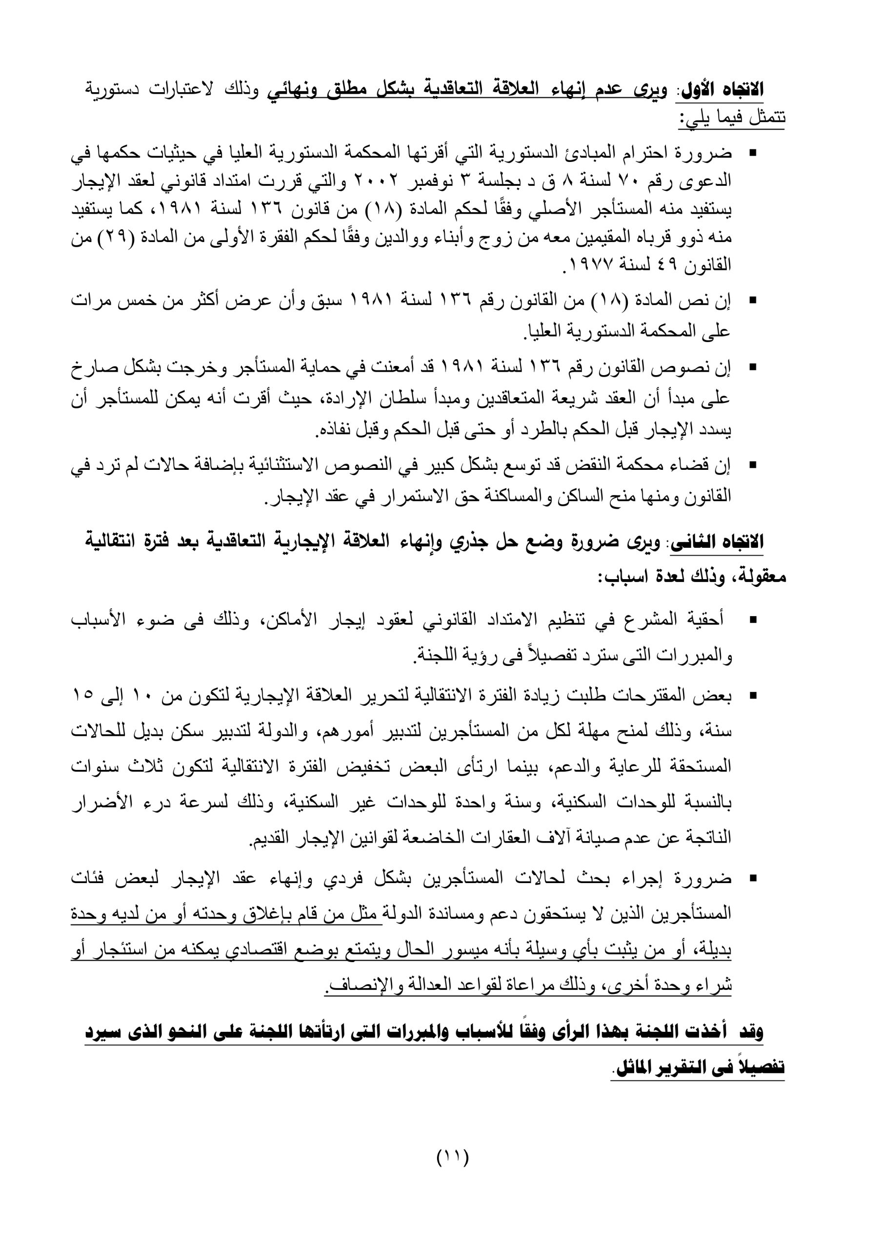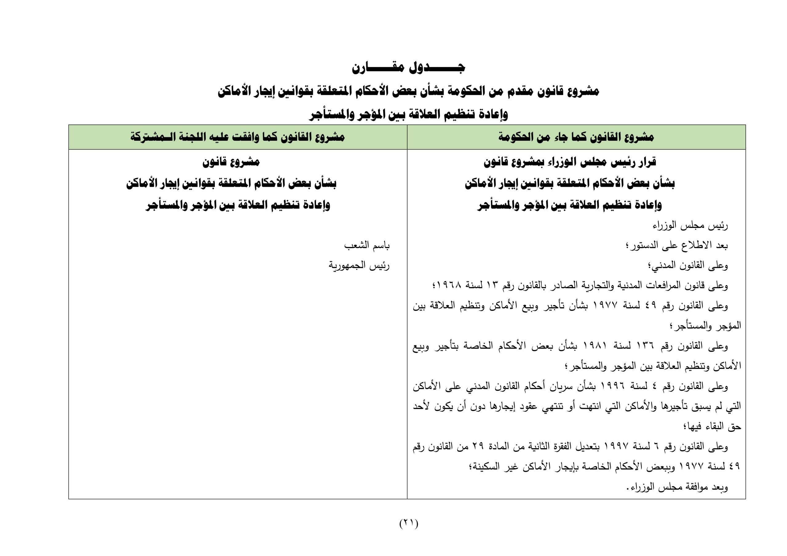 تنتهي عقود إيجار الأماكن السكنية بعد سبع سنوات من تاريخ بدء العمل بهذا القانون، وعقود الأماكن المؤجرة لغير أغراض السكن تنتهي بعد خمس سنوات، ما لم يتفق الطرفان على إنهاء العقد قبل ذلك.