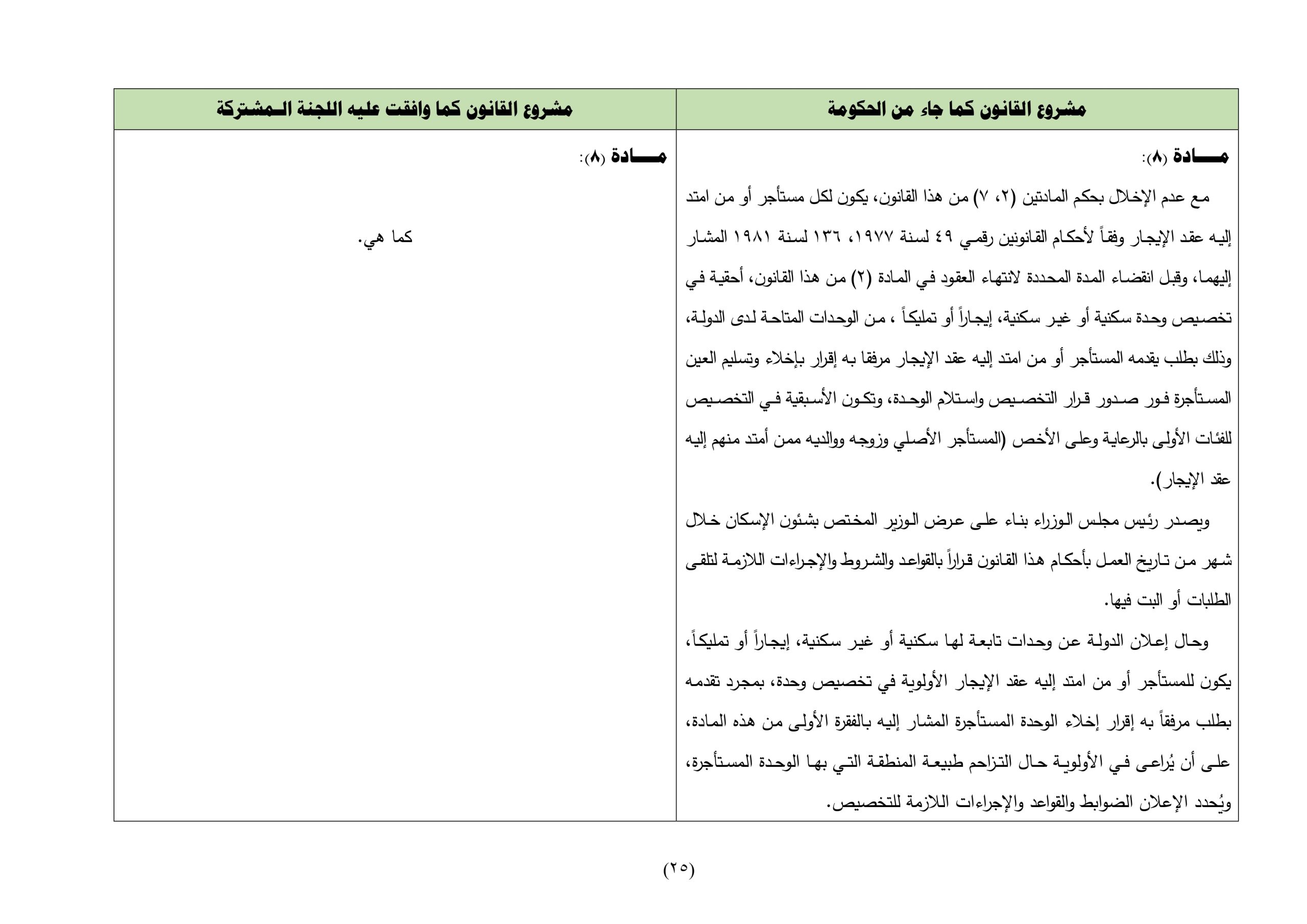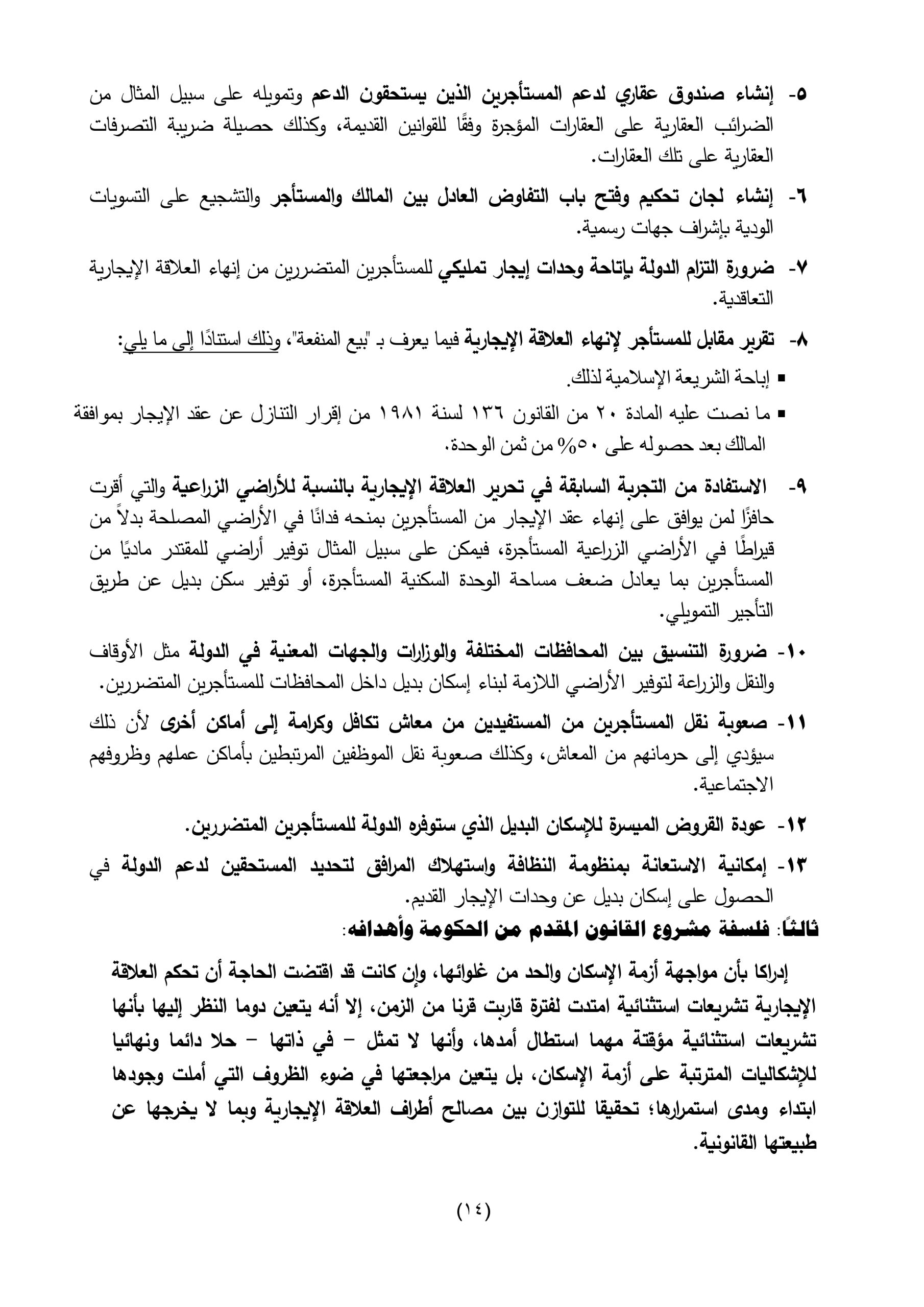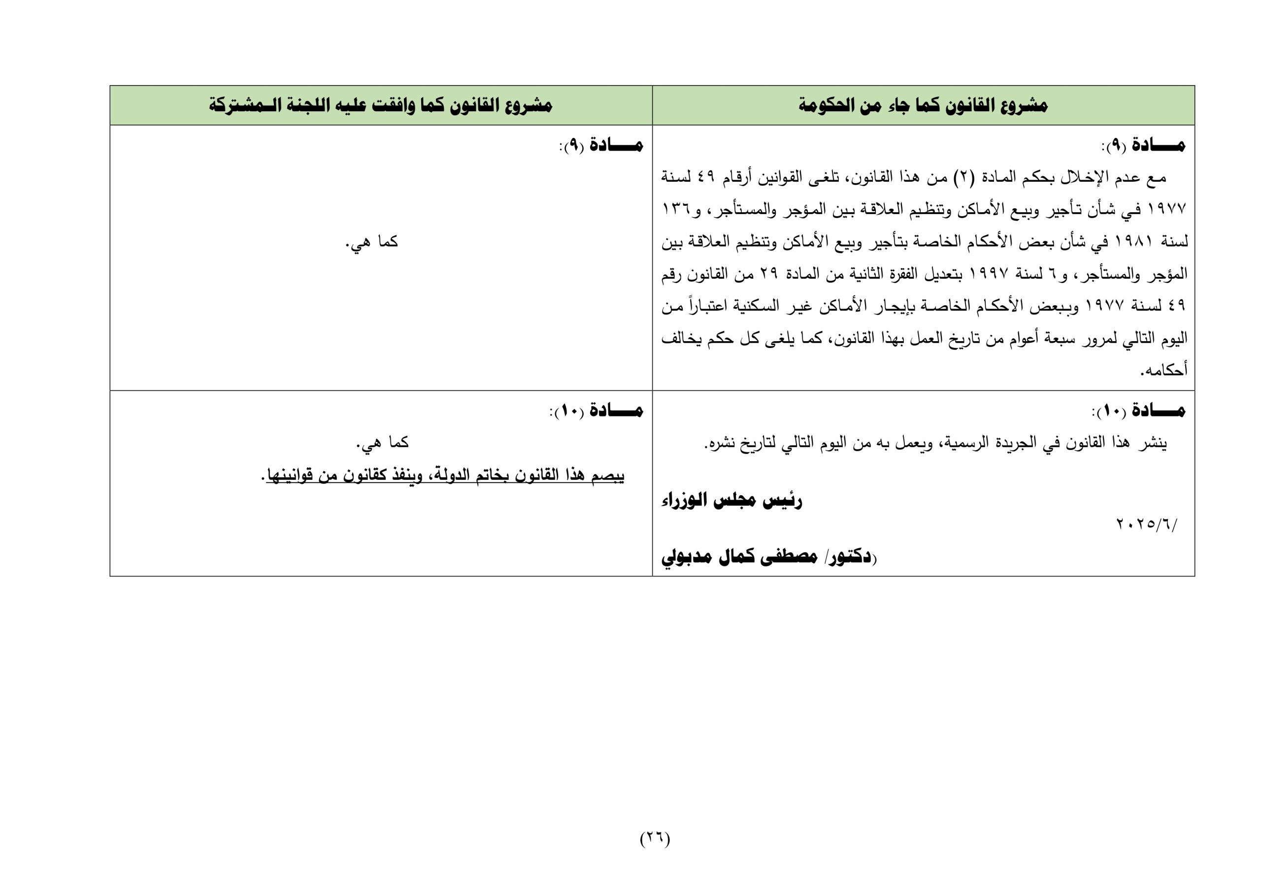 تنتهي عقود إيجار الأماكن السكنية بعد سبع سنوات من تاريخ بدء العمل بهذا القانون، وعقود الأماكن المؤجرة لغير أغراض السكن تنتهي بعد خمس سنوات، ما لم يتفق الطرفان على إنهاء العقد قبل ذلك.