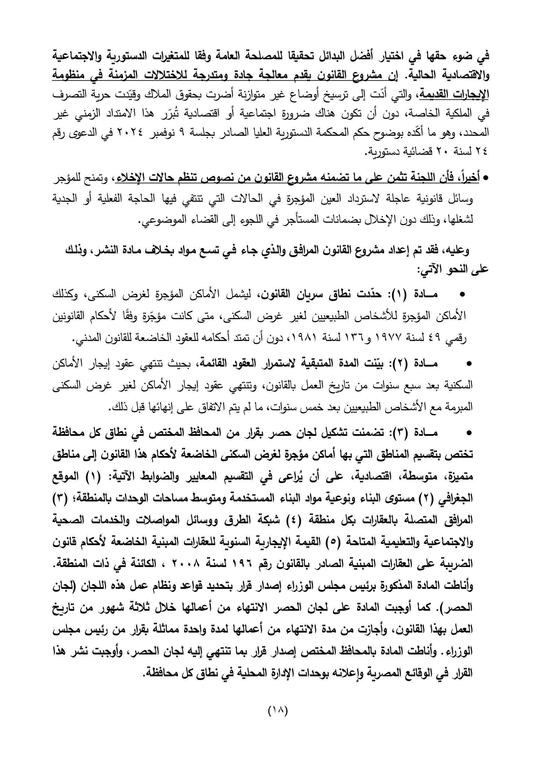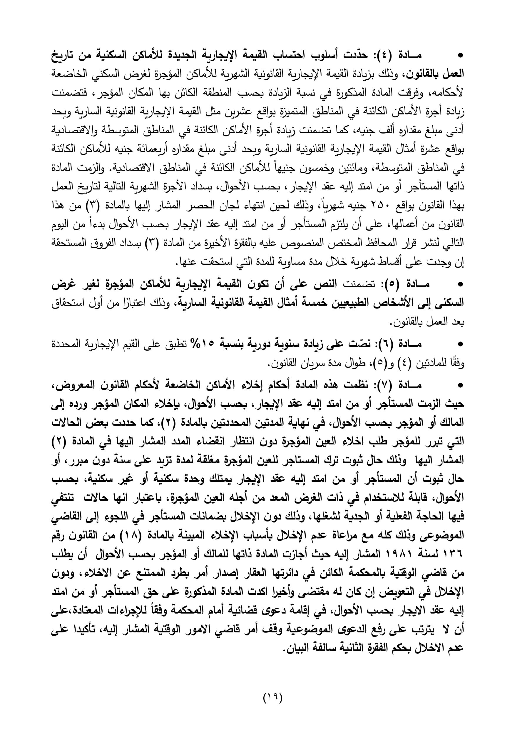 يُطبق هذا القانون على الأماكن المؤجرة لأغراض السكن، وكذلك الأماكن المؤجرة للأشخاص الطبيعيين لغير أغراض السكن، وفقًا لأحكام القانونين رقم 49 لسنة 1977 بشأن تأجير وبيع الأماكن وتنظيم العلاقة بين المؤجر والمستأجر، ورقم 136 لسنة 1981 بشأن بعض الأحكام الخاصة بتأجير وبيع الأماكن وتنظيم العلاقة بين المؤجر والمستأجر.