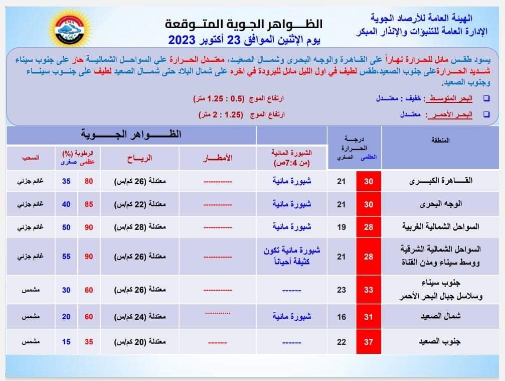 وعن حالة الطقس اليوم، يسود طقس مائل للحرارة نهارا علي القاهرة الكبري والوجه البحرى وشمال الصعيد وجنوب سيناء.