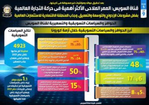 وفي هذا الصدد، نشر المركز الإعلامي لمجلس الوزراء تقريراً تضمن إنفو جرافات تسلط الضوء على قناة السويس الممر الملاحي الأكثر أهمية في حركة التجارة العالمية بفضل مشروعات الازدواج والتوسعة والتعميق، وجذب المنطقة الاقتصادية للاستثمارات العالمية، وذلك بعد تحقيق عوائد ومؤشرات غير مسبوقة في تاريخها.