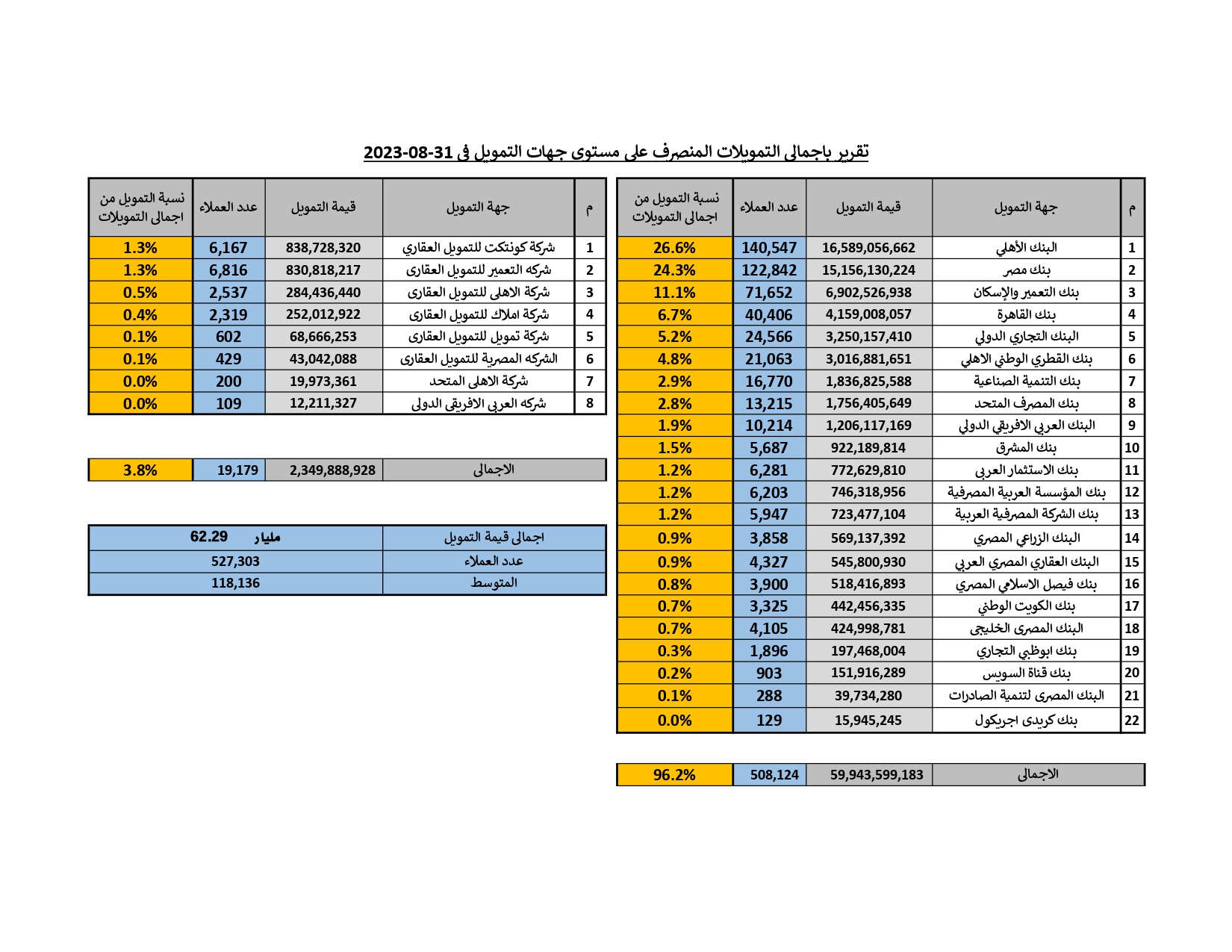 فيما بلغت قيمة التمويلات الموجهة ضمن المبادرة نحو 59.943 مليار جنيه لعدد 508 ألف مستفيد بحصة سوقية استحوذت عليها 22 بنكًا بلغت نحو 96.2%.