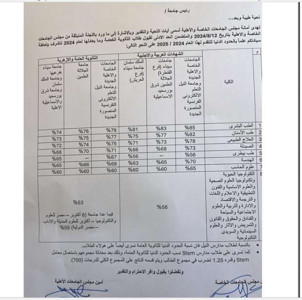 أعلن مجلسي الجامعات الخاصة والأهلية عن الحدود الدنيا للتقدم للكليات بالجامعات الخاصة والأهلية للعام الجامعي 2024-2025، وذلك باعتماد تنسيق 79% لكلية الطب و68% لكلية الهندسة.