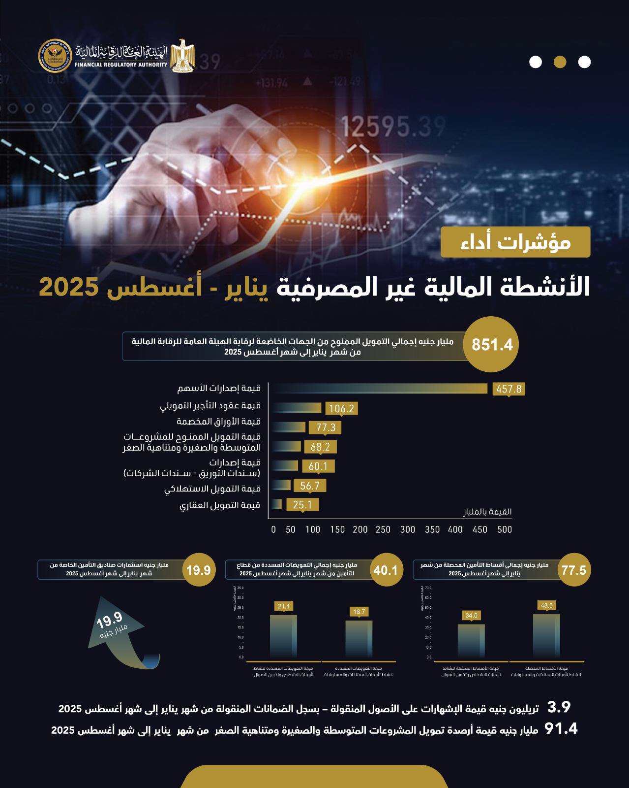 أظهرت أحدث التقارير الصادرة عن الهيئة العامة للرقابة المالية أن إجمالي التمويل الممنوح من خلال الجهات الخاضعة لرقابة الهيئة، في أنشطة سوق رأس المال والتمويل غير المصرفي، بلغ 851.4 مليار جنيه خلال الفترة من يناير وحتى نهاية أغسطس 2025.