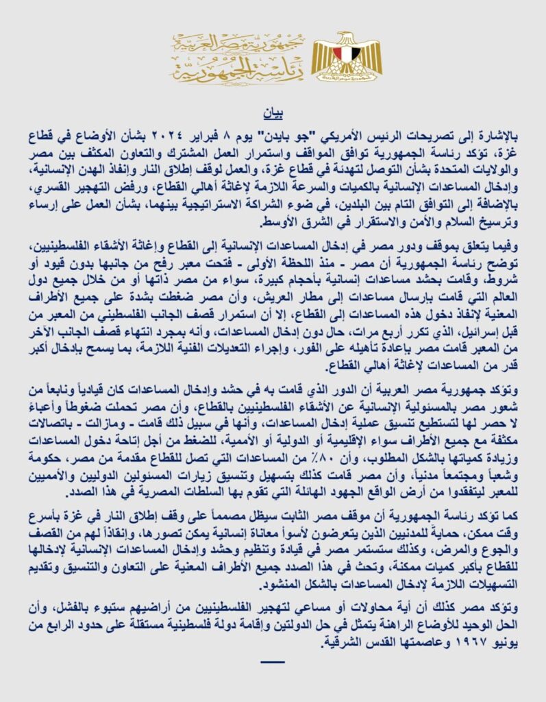 وقال المتحدث: بالإشارة إلى تصريحات الرئيس الأمريكي جو بايدن يوم 8 فبراير 2024 بشأن الأوضاع في قطاع غزة، تؤكد رئاسة الجمهورية توافق المواقف واستمرار العمل المشترك والتعاون المكثف بين مصر والولايات المتحدة بشأن التوصل لتهدئة في قطاع غزة.