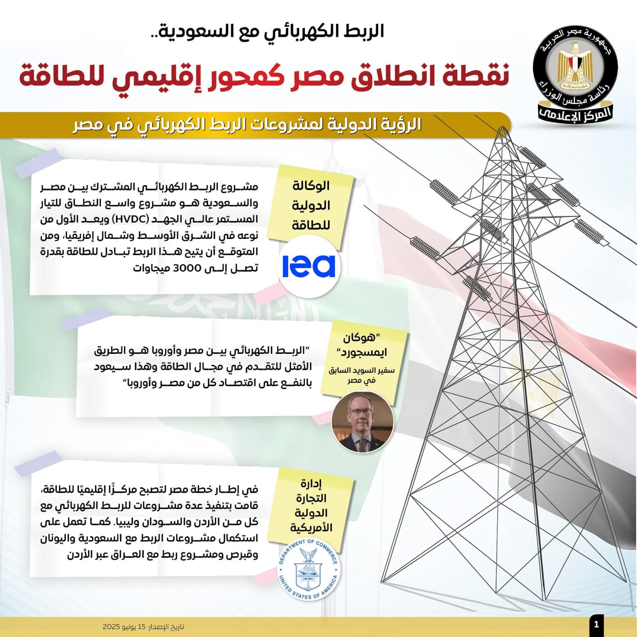وأوضحت الإنفوجرافات أن الربط الكهربائي المصري السعودي بمثابة خطوة استراتيجية نحو شبكة عربية موحدة.