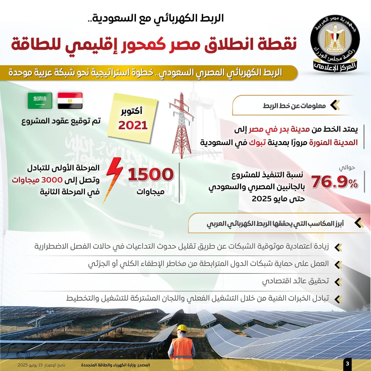 وبلغت نسبة التنفيذ للمشروع بالجانبين المصري والسعودي 76.9% حتى مايو 2025، كما تصل قدرات المرحلة الأولى للتبادل 1500 ميجاوات، أما الثانية فتصل إلى 3000 ميجاوات.