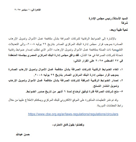 بالإشارة إلى الضوابط الرقابية لشركات الصرافة بشأن مكافحة غسل الأموال وتمويل الإرهاب الصادرة بموجب قرار مجلس إدارة البنك المركزي الصادر بتاريخ ۲۹ يوليه ۲۰۰۸، وإلى التعديلات التشريعية ذات الصلة بمكافحة غسل الأموال وتمويل الإرهاب، الأمر الذي تطلب إصدار ضوابط رقابية محدثة لشركات الصرافة في هذا الشأن، فقد وافق مجلس إدارة البنك المركزي المصري بجلسته المنعقدة في ۲۷ أغسطس ۲۰۲۵ على القرار التالي: