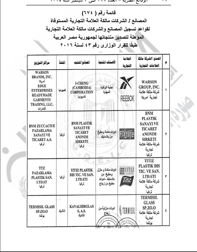 تقيد المصانع والشركات مالكة العلامة التجارية المبينة أسماؤها بالقوائم المرفقة رقم 674 طبقا للقرار الوزاري رقم 43 لسنة 2016 في سجل المصانع والشركات مالكة العلامة التجارية المؤهلة لتصدير منتجاتها إلى جمهورية مصر العربية والمنشأ لهذا الغرض بالهيئة العامة للرقابة على الصادرات والواردات، وهم.