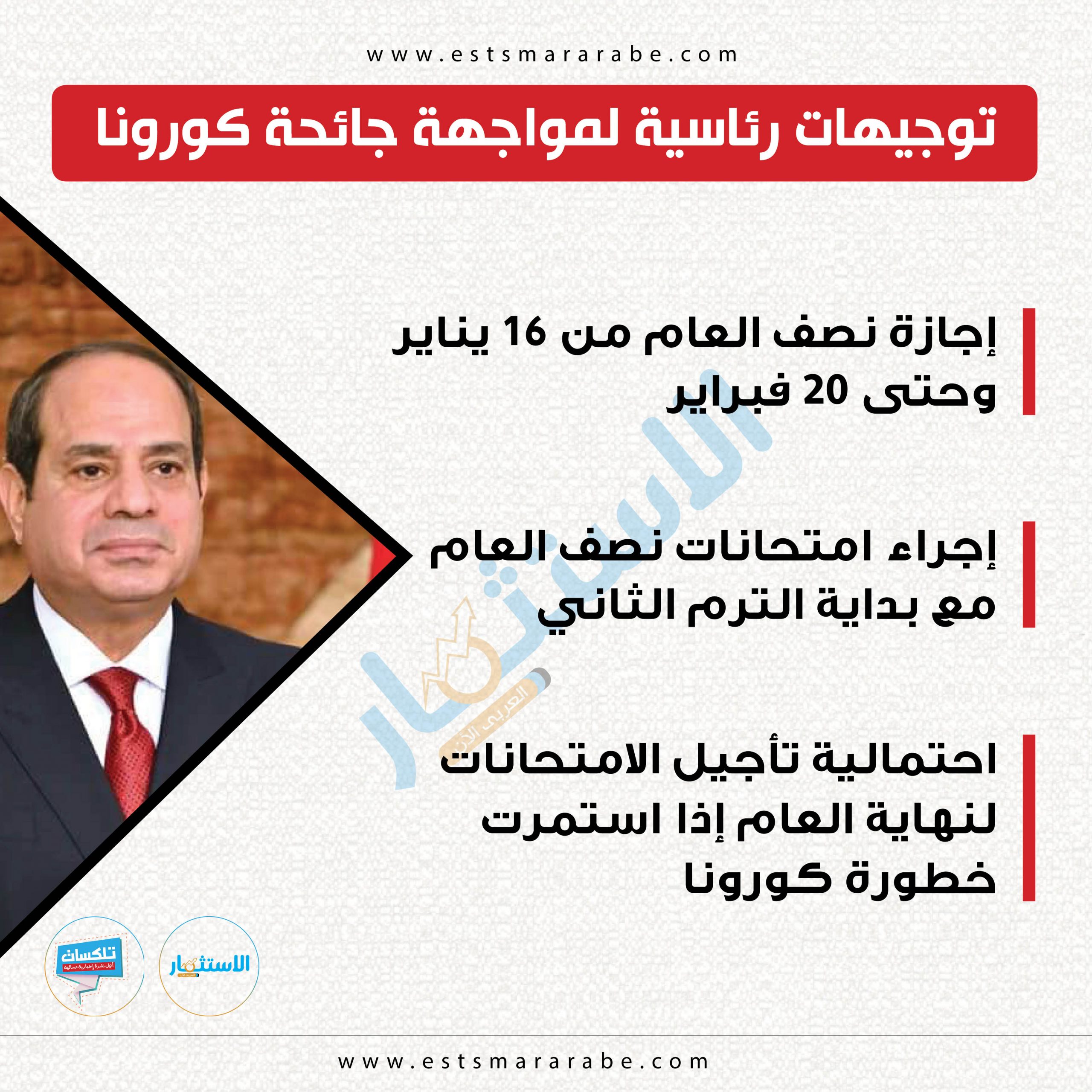 إنفوجراف ||| توجيهات رئاسية لمواجهة جائحة كورونا ads في الخميس, 31 ديسمبر, 2020 - 3:53 مساءً شارك FacebookTwitterTelegramWhatsAppPinterestالبريد الإلكتروني إنفوجراف ||| توجيهات رئاسية لمواجهة جائحة كورونا – إجازة نصف العام من 16 يناير وحتى 20 فبراير – إجراء امتحانات نصف العام مع بداية الترم الثاني – احتمالية تأجيل الامتحانات لنهاية العام إذا استمرت خطورة كورونا Ads الرابط المختصر: https://estsmararabe.com/?p=26810اضغط لنسخ الرابط تابعنا على: نبض جوجل نيوز تليجرام
