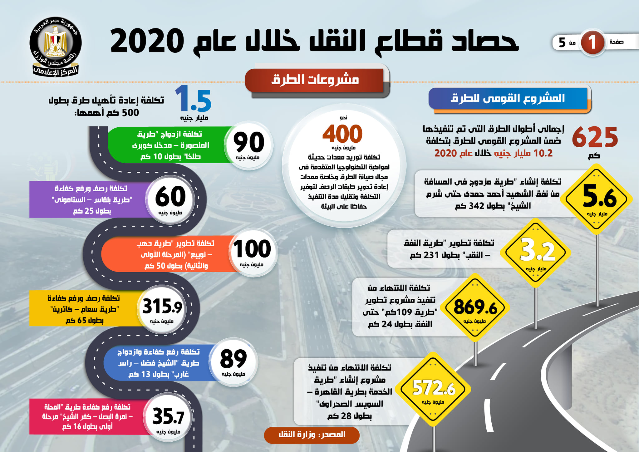 بالإنفوجراف… إنشاء 625 كم طرق بتكلفة 10.2 مليار جنيه “حصاد النقل خلال 2020 “