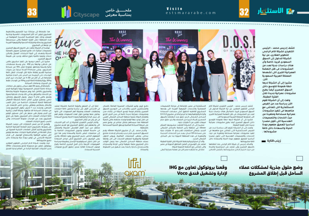 وأضاف إدريس أن شركة اكام الراجحى منذ انطلاقها بالسوق المصرى وهى تعتمد على استراتيجية واضحة من حيث اختيار أماكن مشروعاتها بأفضل الأماكن الاستثمارية فى مصر، بالإضافة إلى مراعاة التصميمات المعمارية والخدمات الترفيهية الفريدة التى يقدمها المشروع لقاطنيه لتحقيق أعلى معدلات السعادة والراحة والرفاهية وهذا ما تم مراعاته فى مشروع D.O.S.E الساحل الشمالى الذى حقق منذ انطلاقه بالسوق المصرى إقبالا كبيرا من العملاء والذى حقق حجم مبيعات تقترب من 5 مليارات جنيه .