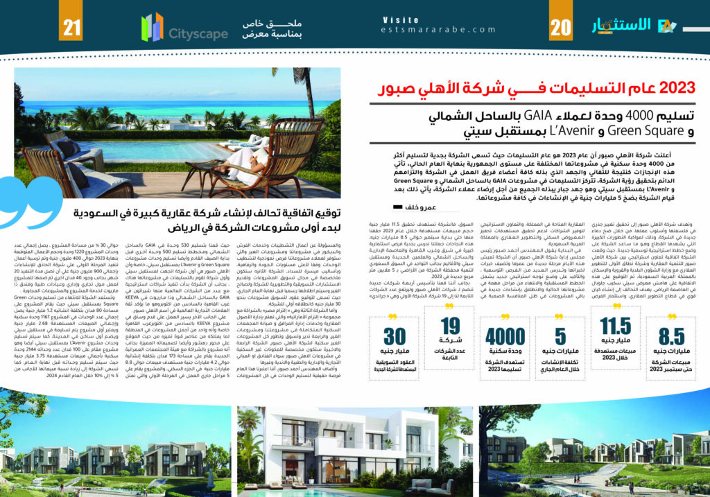 أعلنت شركة الأهلي صبور أن عام 2023 هو عام التسليمات حيث تسعى الشركة بجدية لتسليم أكثر من 4000 وحدة سكنية في مشروعاتها المختلفة على مستوى الجمهورية بنهاية العام الحالي، تأتي هذه الإنجازات كنتيجة للتفاني والجهد الذي بذله كافة أعضاء فريق العمل في الشركة والتزامهم الدائم بتحقيق رؤية الشركة، تتركز التسليمات في مشروعات GAIA بالساحل الشمالي و Green Square و L’Avenir بمستقبل سيتي وهو جهد جبار يبذله الجميع من أجل إرضاء عملاء الشركة، يأتي ذلك بعد قيام الشركة بضخ 5 مليارات جنية في الإنشاءات في كافة مشروعاتها.