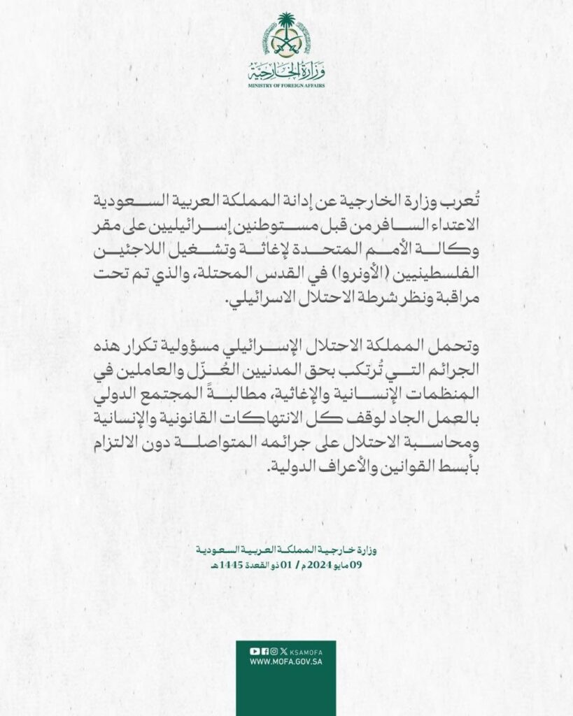 أعربت وزارة الخارجية عن إدانة المملكة العربية السعودية، الاعتداء السافر من قبل مستوطنين إسرائيليين على مقر وكالة الأمم المتحدة لإغاثة وتشغيل اللاجئين الفلسطينيين (الأونروا) في القدس المحتلة، والذي تم تحت مراقبة ونظر شرطة الاحتلال الاسرائيلي.