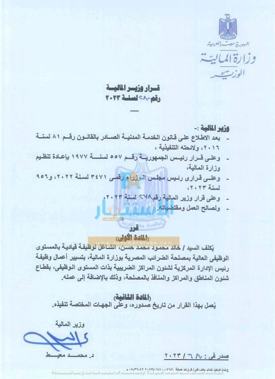 كما أصدر قرارا بتعيين رشا عبد العال حسن عبد الله راضي في منصب نائب رئيس مصلحة الضرائب بشكل مؤقت.