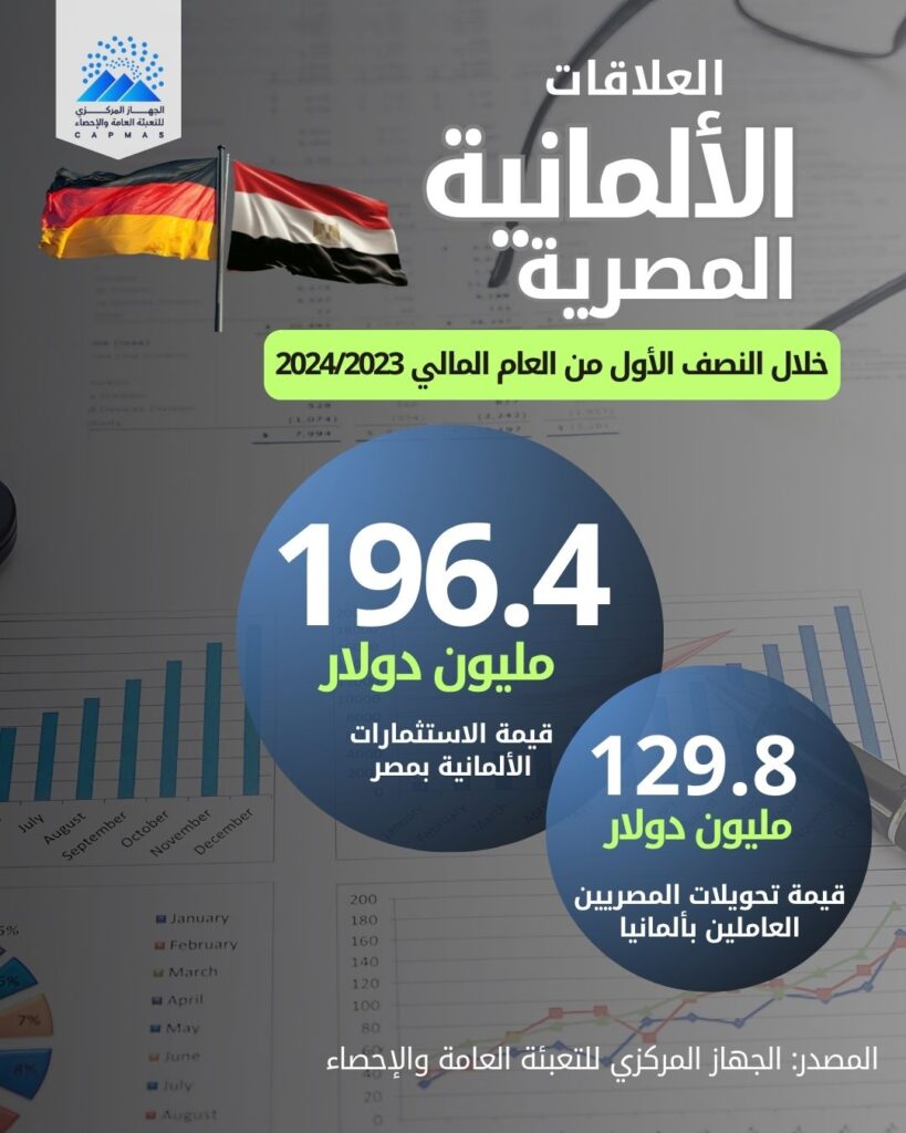وقد أظهرت بيانات الجهاز ارتفاع حجم التبادل التجارى بين مصر وألمانيا مسجلاً 2.5 مليار دولار خلال النصف الأول من عام 2024 مقابل 2.4 مليار دولار خلال نفس الفترة من عام 2023 بنسبة ارتفاع قدرها 4.2%