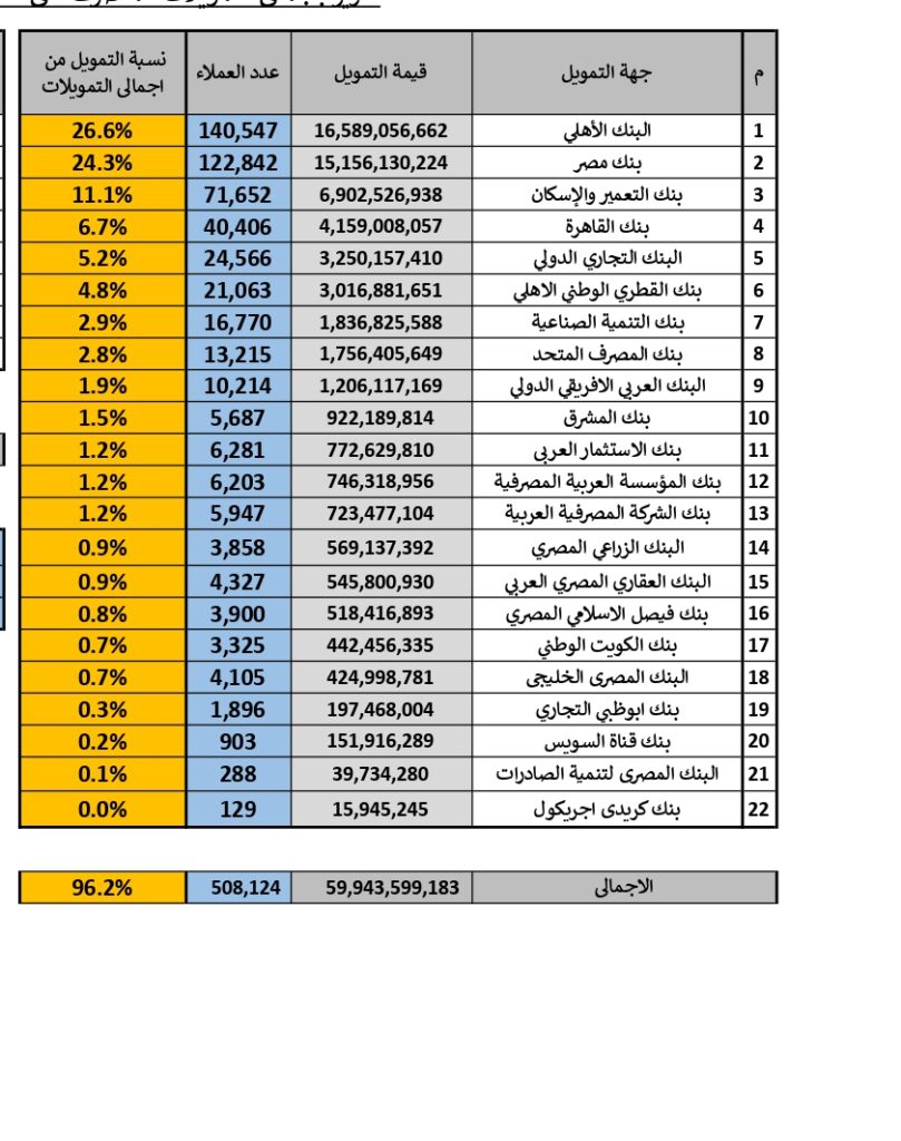بينما كان في المرتبة الرابعة بنك القاهرة، بقيمة تمويلية بلغت نحو 4.145 مليار جنيه، بحصة سوقية 6.7% موجهة لصالح 40.4 ألف عميل.